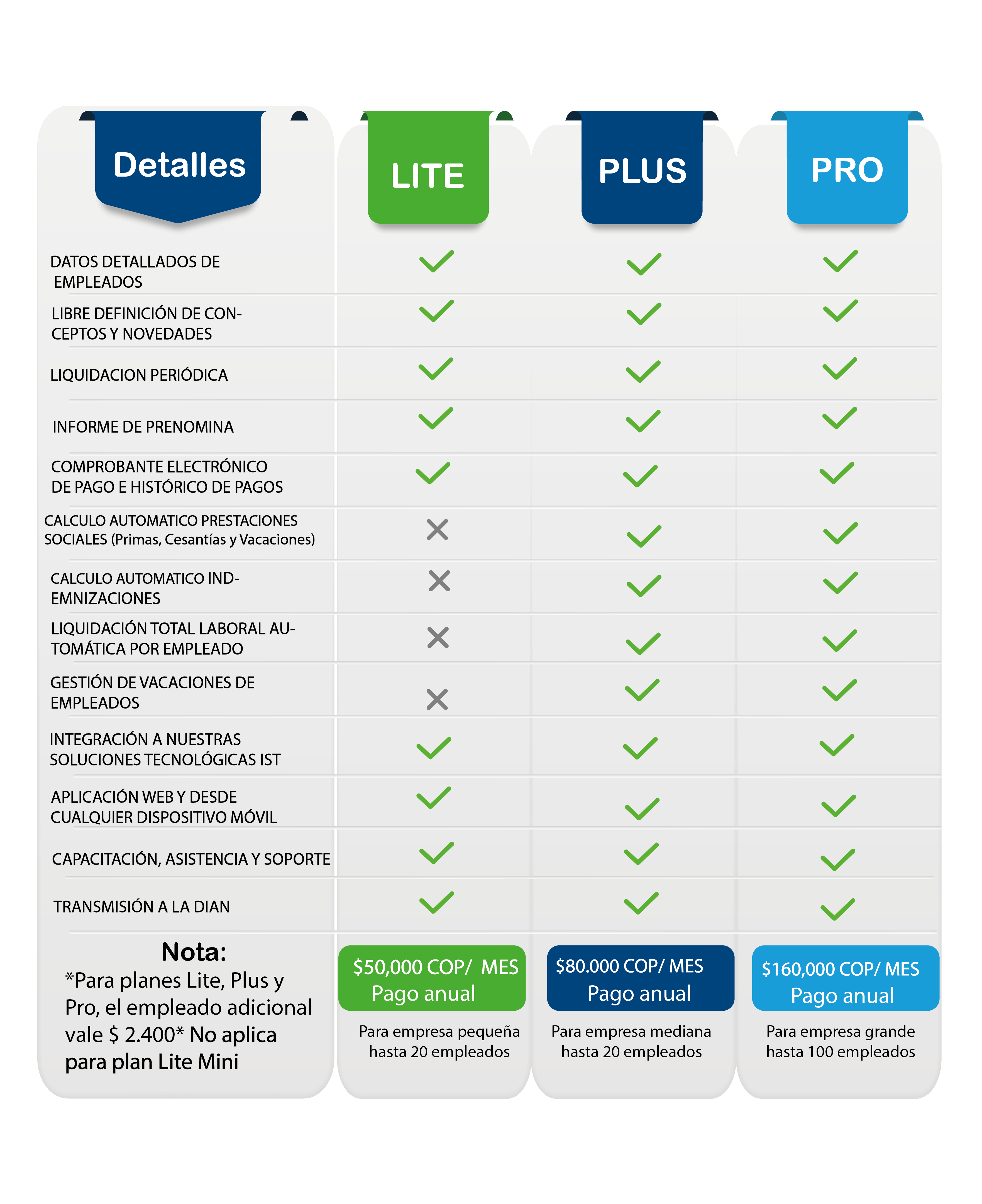 Nota:Para cualquiera de los planes se cobra la primera y única vez $100,000 + IVA como costo de implementación